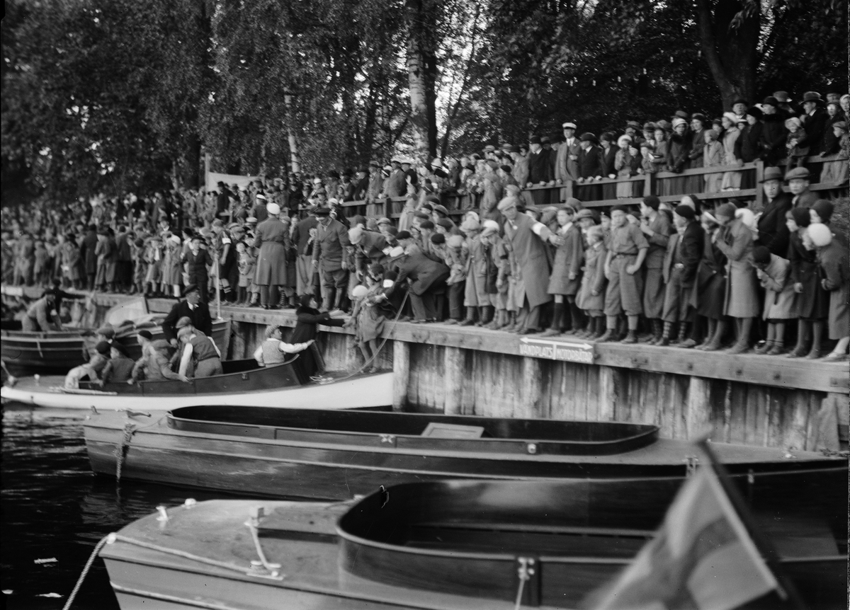 Trängsel när barn går ombord på motorbåtar som ska ta dem till "Barnens ö" vid Liljekonvaljeholmen, Fyrisåns strand, Stadsträdgården