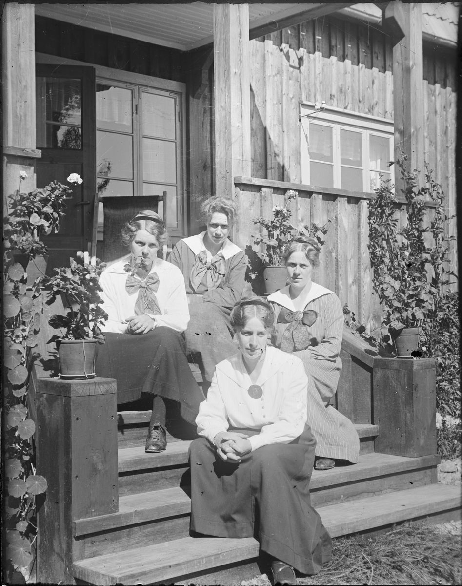 Systrarna Sandén sitter på förstutrappan, Uppland
