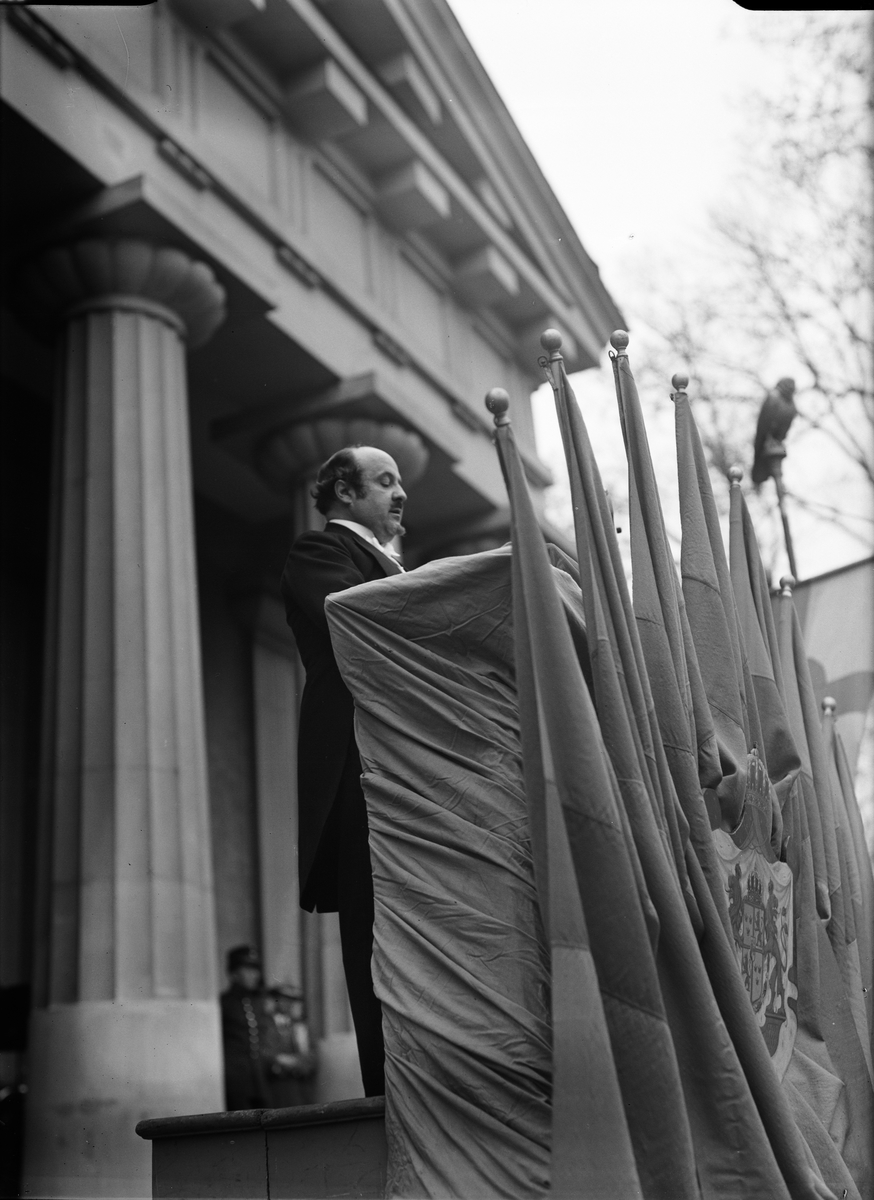 Vårfesttalaren och författaren Ludvig "Lubbe" Nordström i talarstolen på Uppsala studentkårs vårfest i Botaniska trädgården