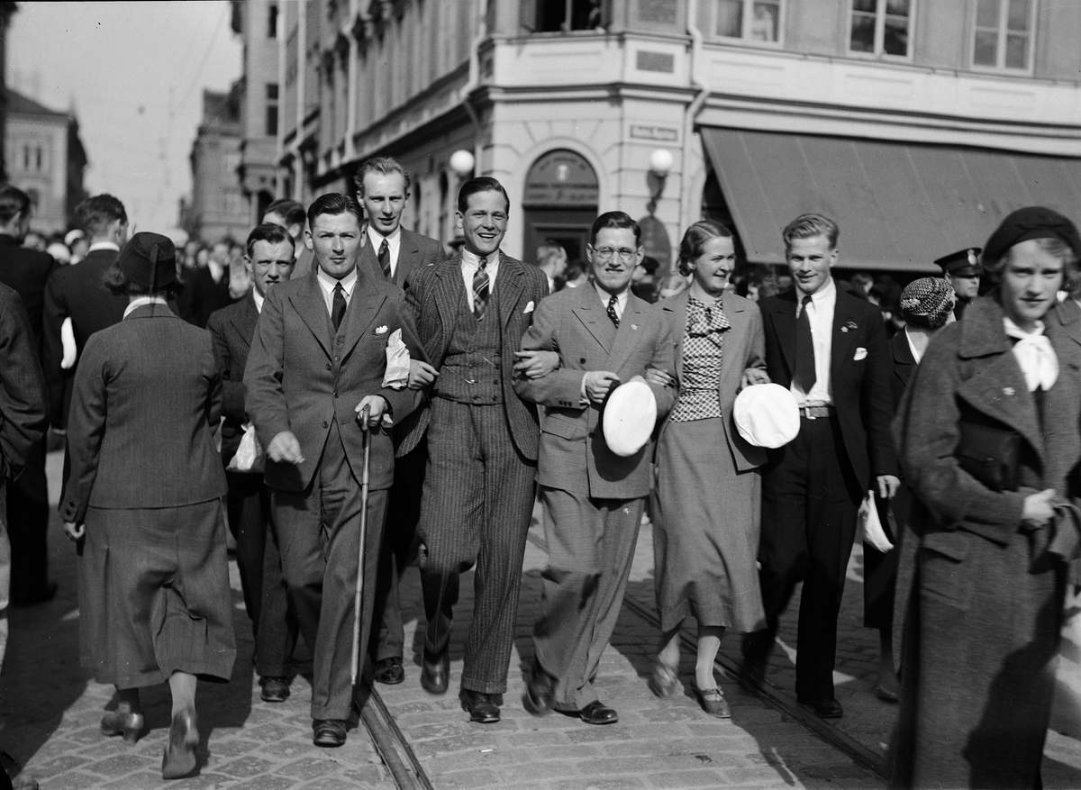 "Studenternas hyllning till våren" - studenter firar "sista april", Drottninggatan - Östra Ågatan, Uppsala 1934
