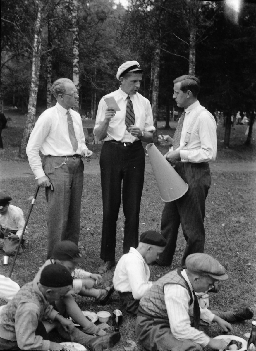 Köpman Bror Zentio, lekledaren kandidat Lidman och dr Ola Månsson på SMK Uppsalas utflykt för Uppsalabarn, sannolikt Länna i Almunge socken