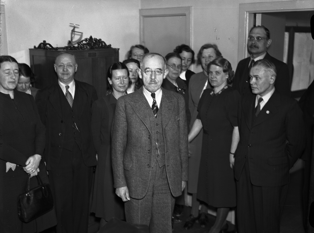 Postmästare Wilhelm Petrelius uppvaktas av personalen när han går i pension, Postverket, Kungsängsgatan 19