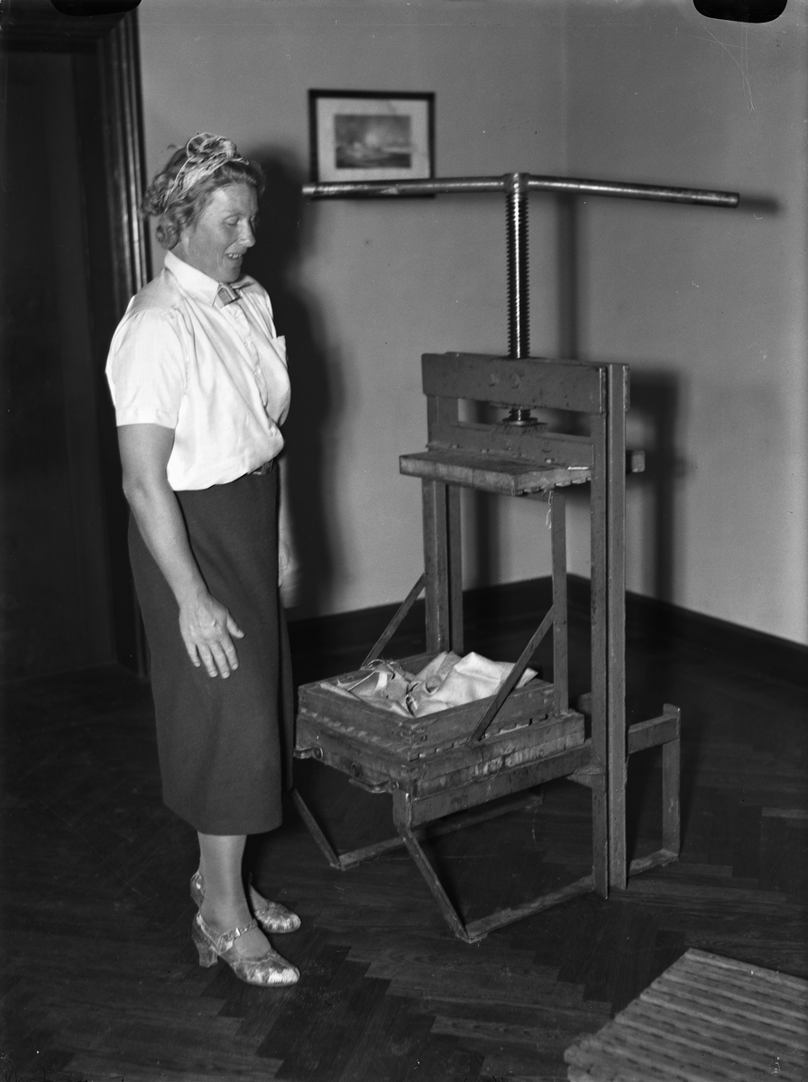 Hemkonsulent Rut Ingeborg Högstedt demonstrerar en mustpress på Hushållningssällskapets konserveringskurs, Hantverksföreningen, Nedre Slottsgatan 6
