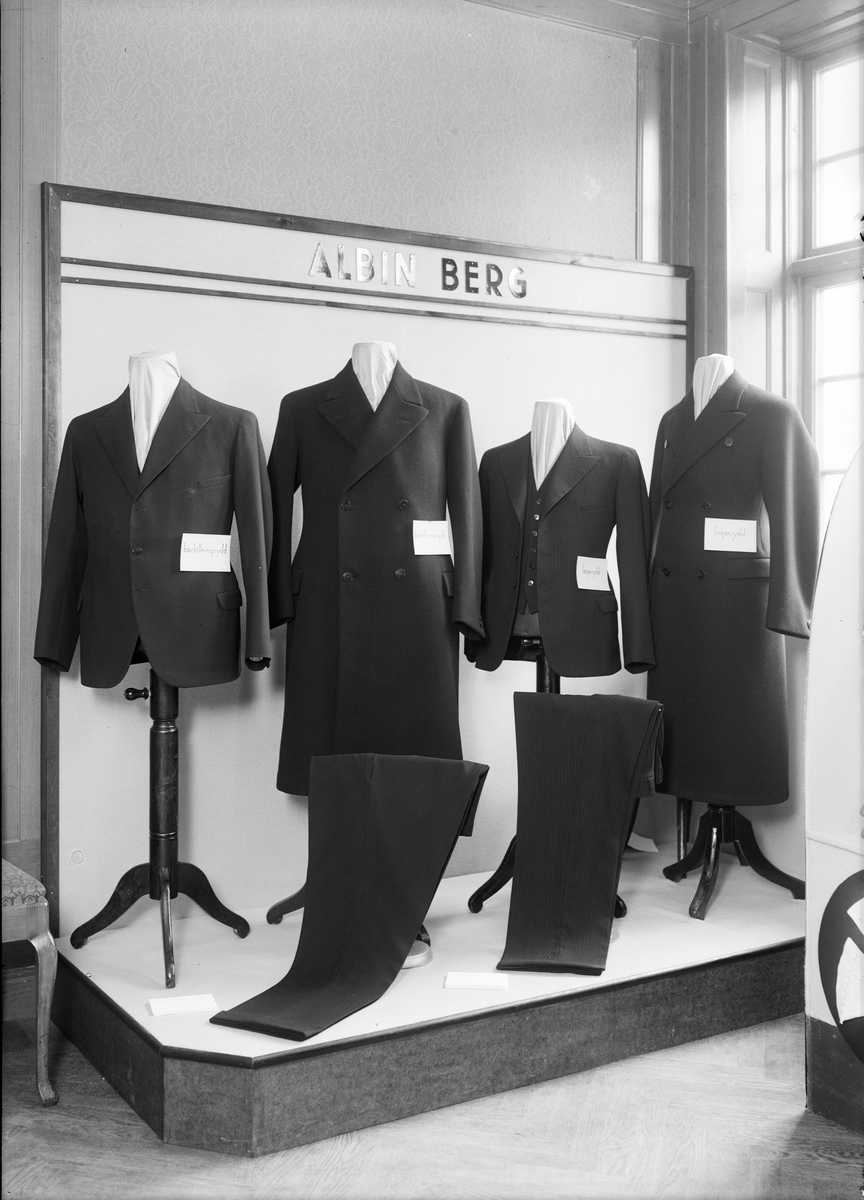 Albin Bergs skrädderis monter i beklädnadsavdelningen på Upsala Fabriks- och handtverksförenings utställning, en trappa upp, Nedre Slottsgatan 6