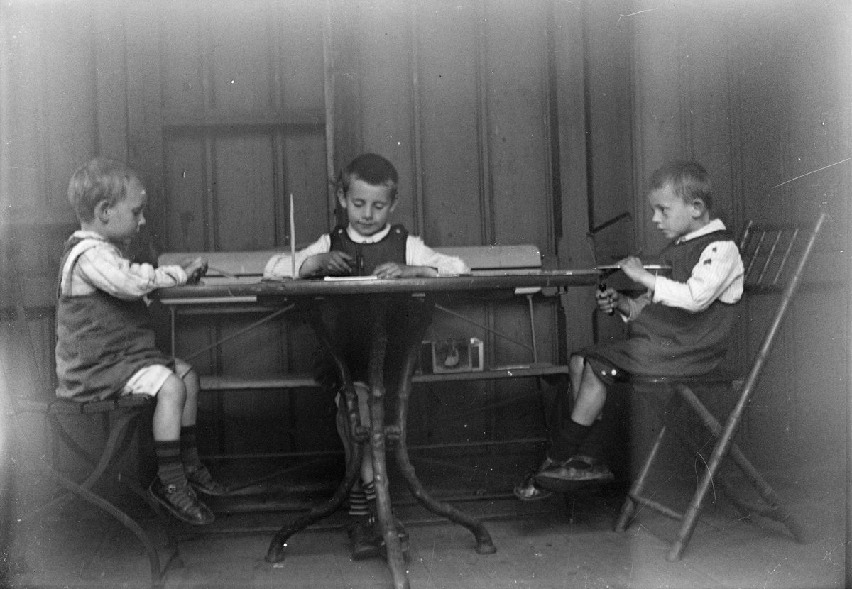 Christiane och Ruben Liljefors söner, Alf, Ingemar och Roland, sitter vid bordet och leker, sannolikt i hemmet i Sverige