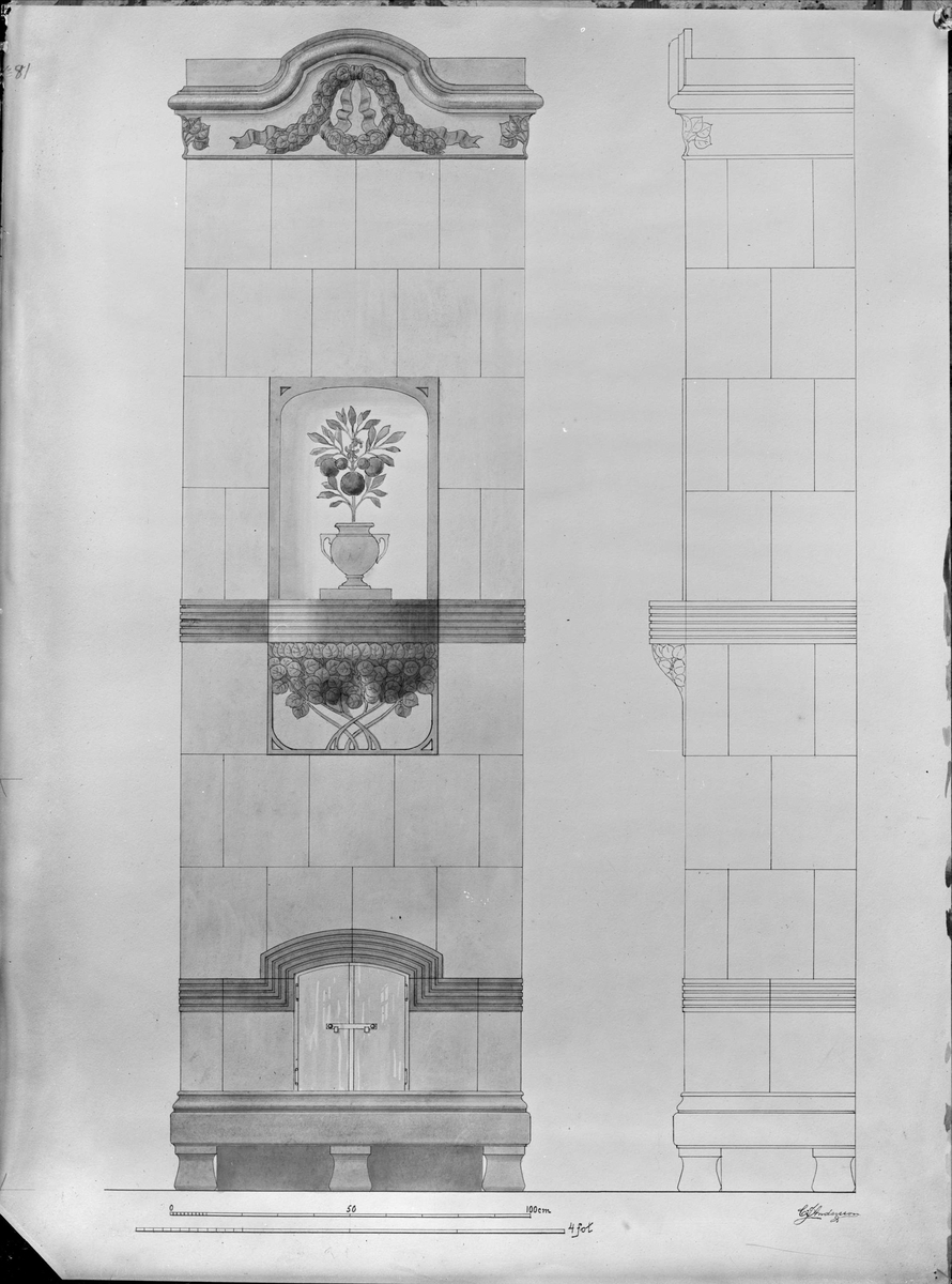 Titel: Ritning till kakelugn för Upsala Kakelfabriks AB, Uppsala 1906