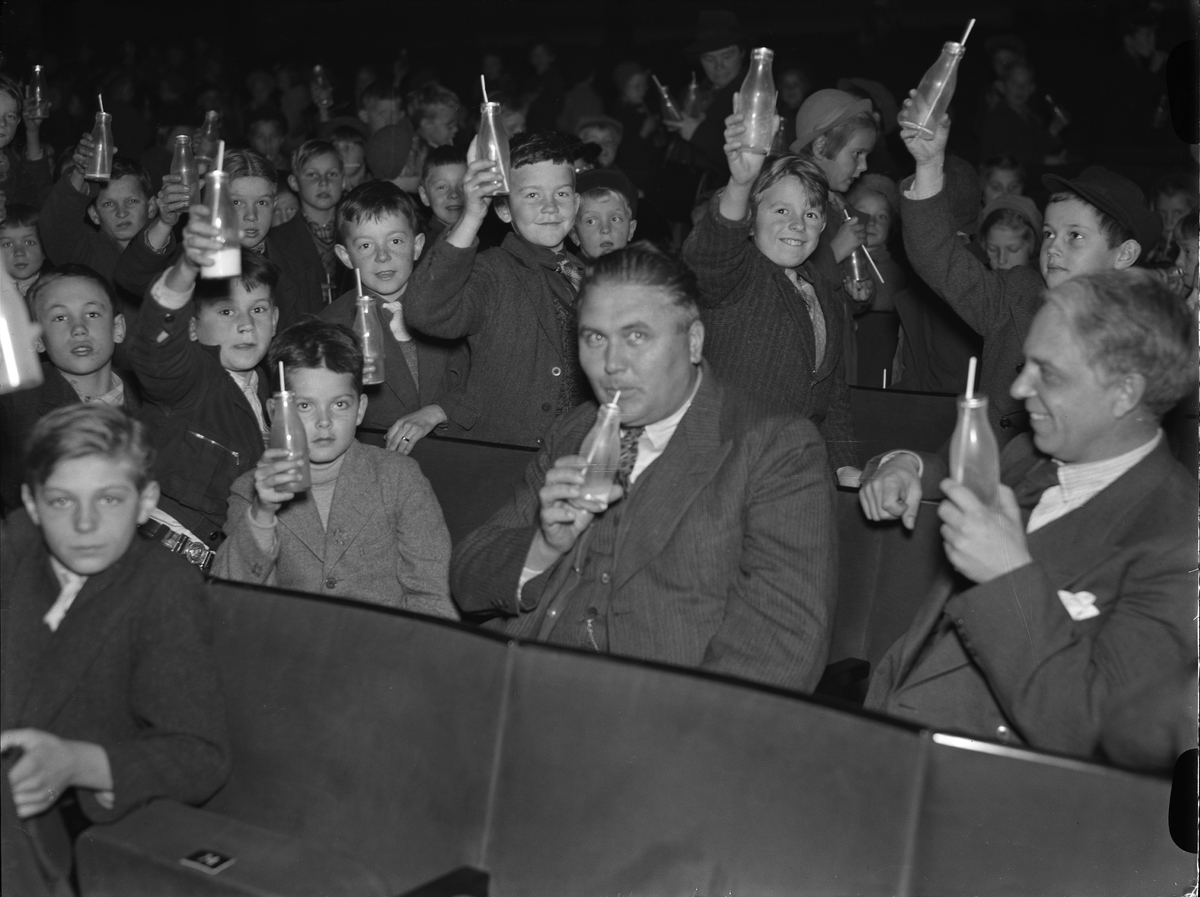 Skolelever och två män dricker mjölk på biograf Fågel Blå