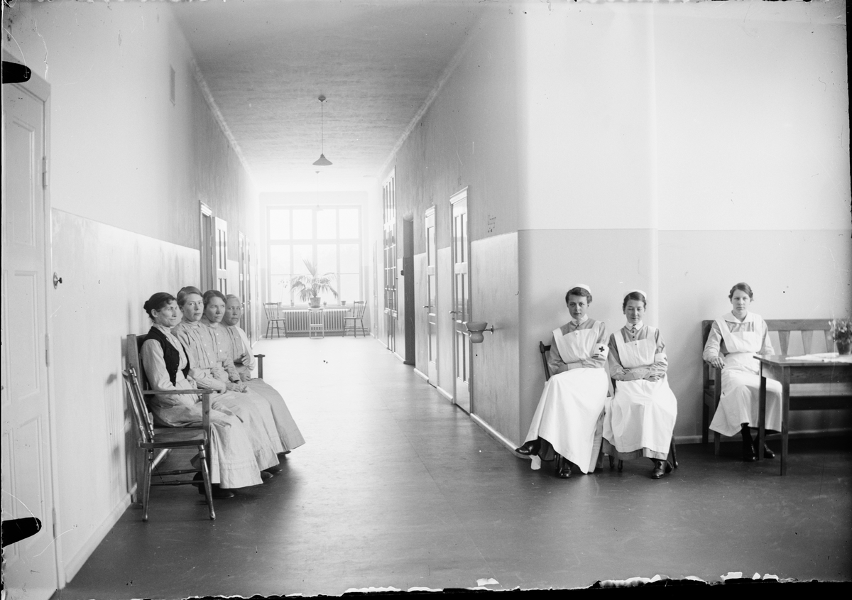 Sjukvårdspersonal och patienter i en korridor, Östhammars lasarett, Uppland