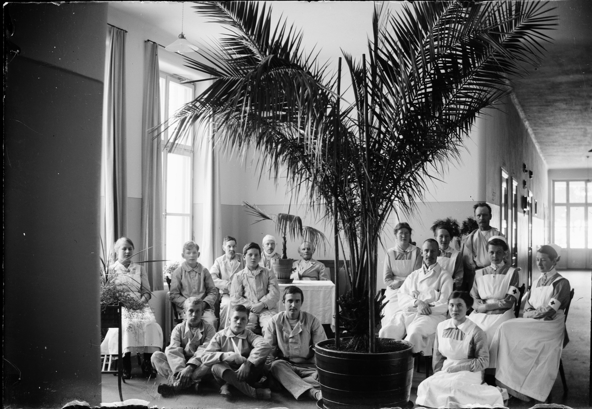 Sjukvårdspersonal och patienter i en korridor, Östhammars lasarett, Uppland
