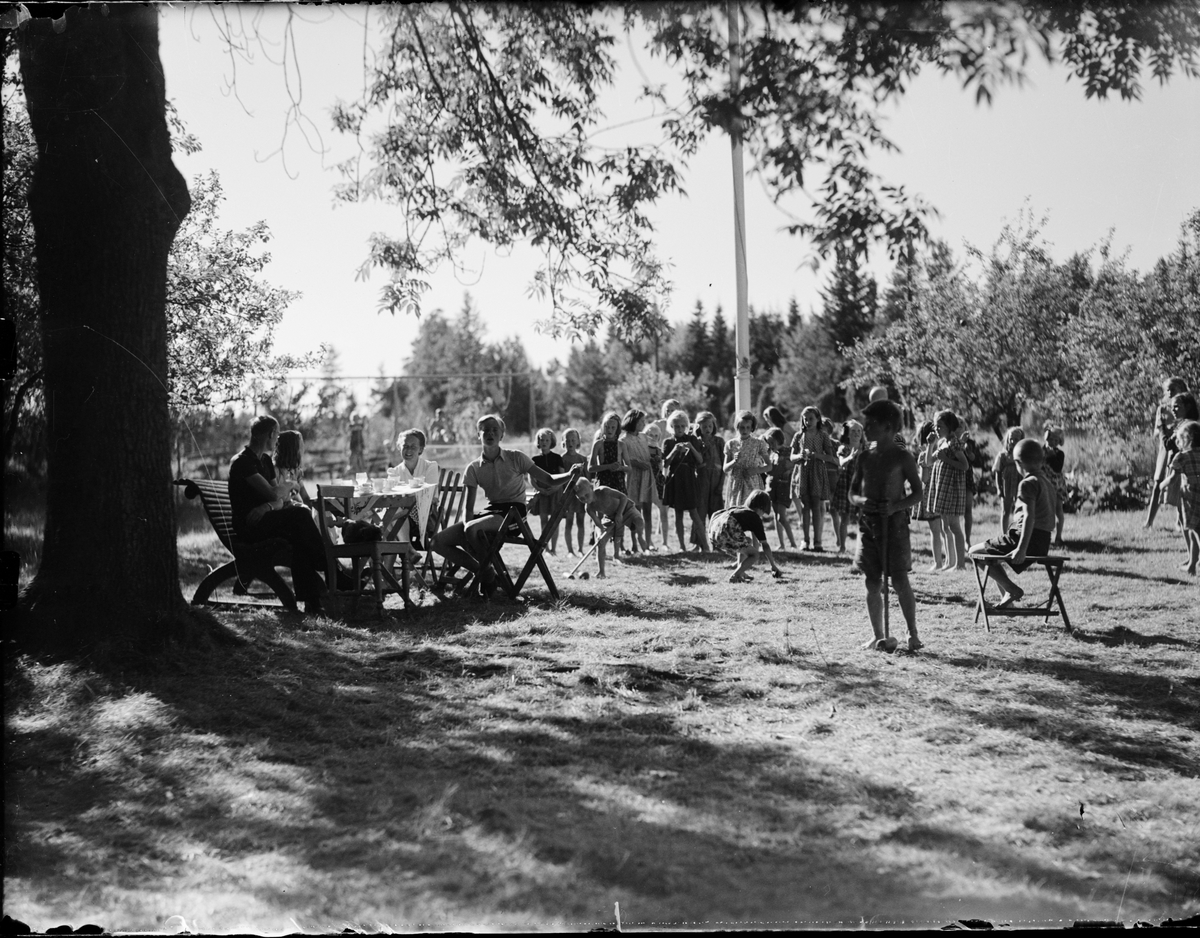 Barnkoloni - barn spelar krocket och vuxna sitter vid kaffebord, Sandika, Harg socken, Uppland