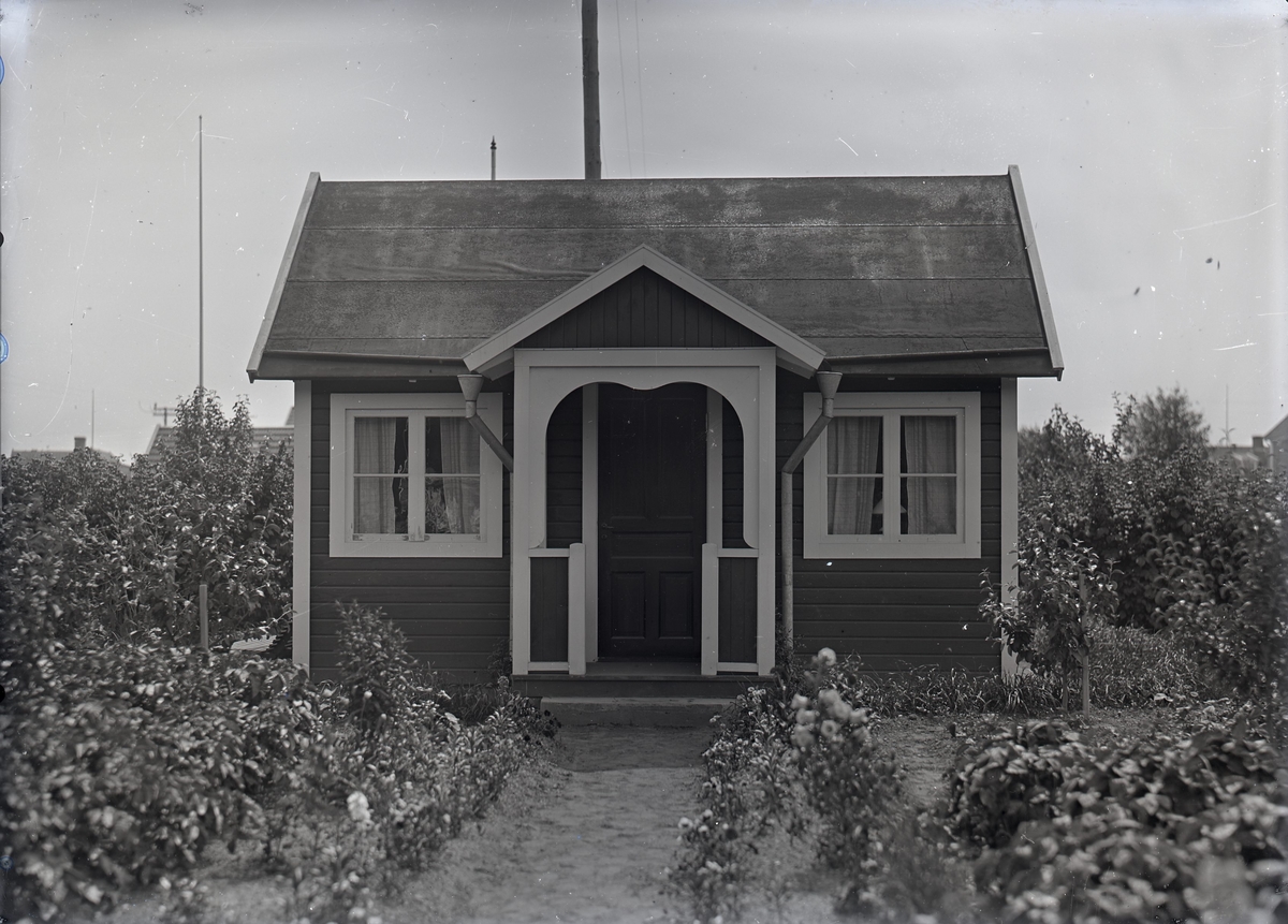 En stuga vid Kalmar södra koloniområde, fotograferad omkring 1930. Kalmar södra koloniförening grundades 1917 och har idag 105 kolonilotter. Området ligger strax söder om länssjukhuset i Kalmar med huvudingång från Stensbergsvägen.