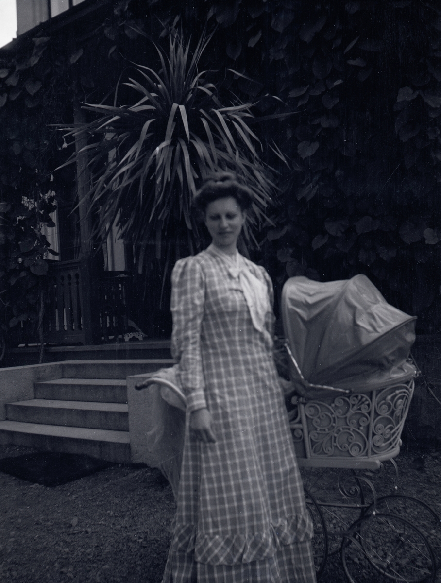 Hillevi med barnvagn vid trappan på Tuna gård. Gift med Olle H.
