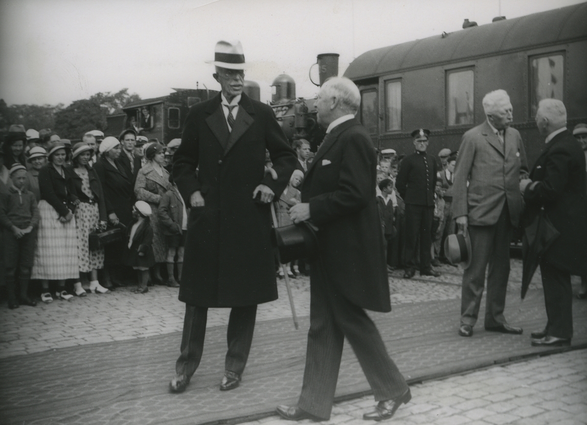 Kung Gustav V och prins Eugen tas emot vid järnvägsstationen i Kalmar.