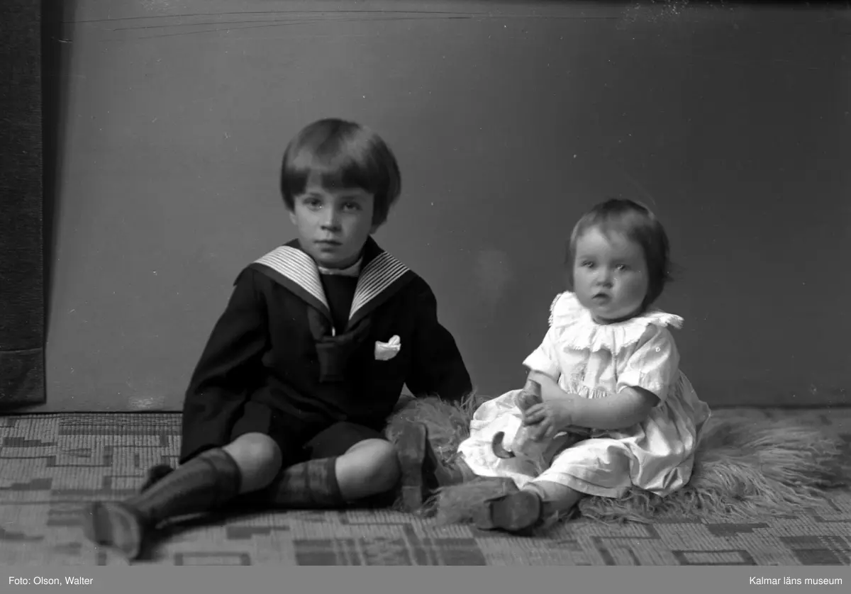 Ateljébild på en flicka och en pojke i sjömanskostym. Enligt Walter Olsons journal är bilden beställd av frun till pastor Lund.