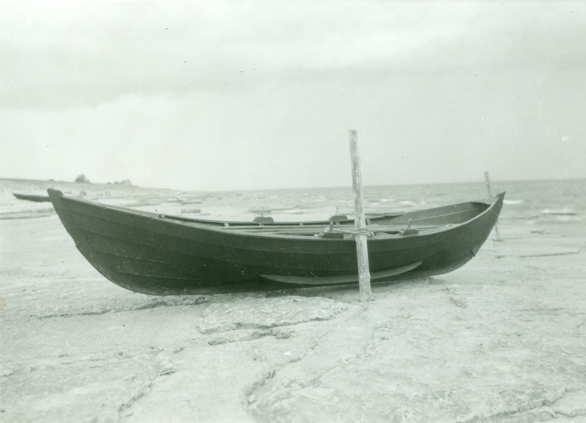 Titel: Båt fastgjord vid i flisan nersatt stång för att icke tagas av sjön. Denna strandflisa som översköljes av vågorna kallas "hällpallen"