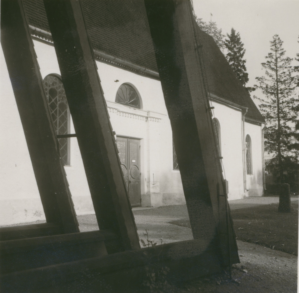 En församlingskyrka med ben ifrån en klockstapel i förgrunden i Mortorp.