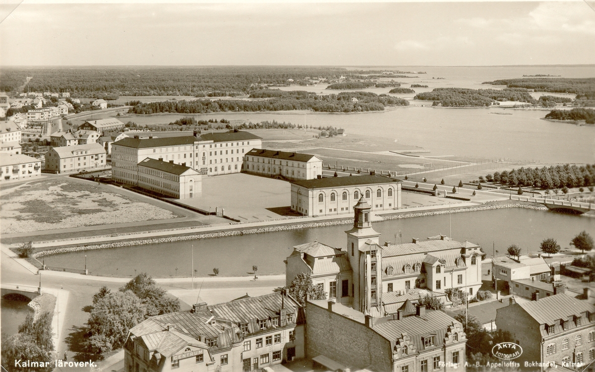 Kalmar högre allmänna läroverk (Stagneliusskolan) från vattentornet, vykort.