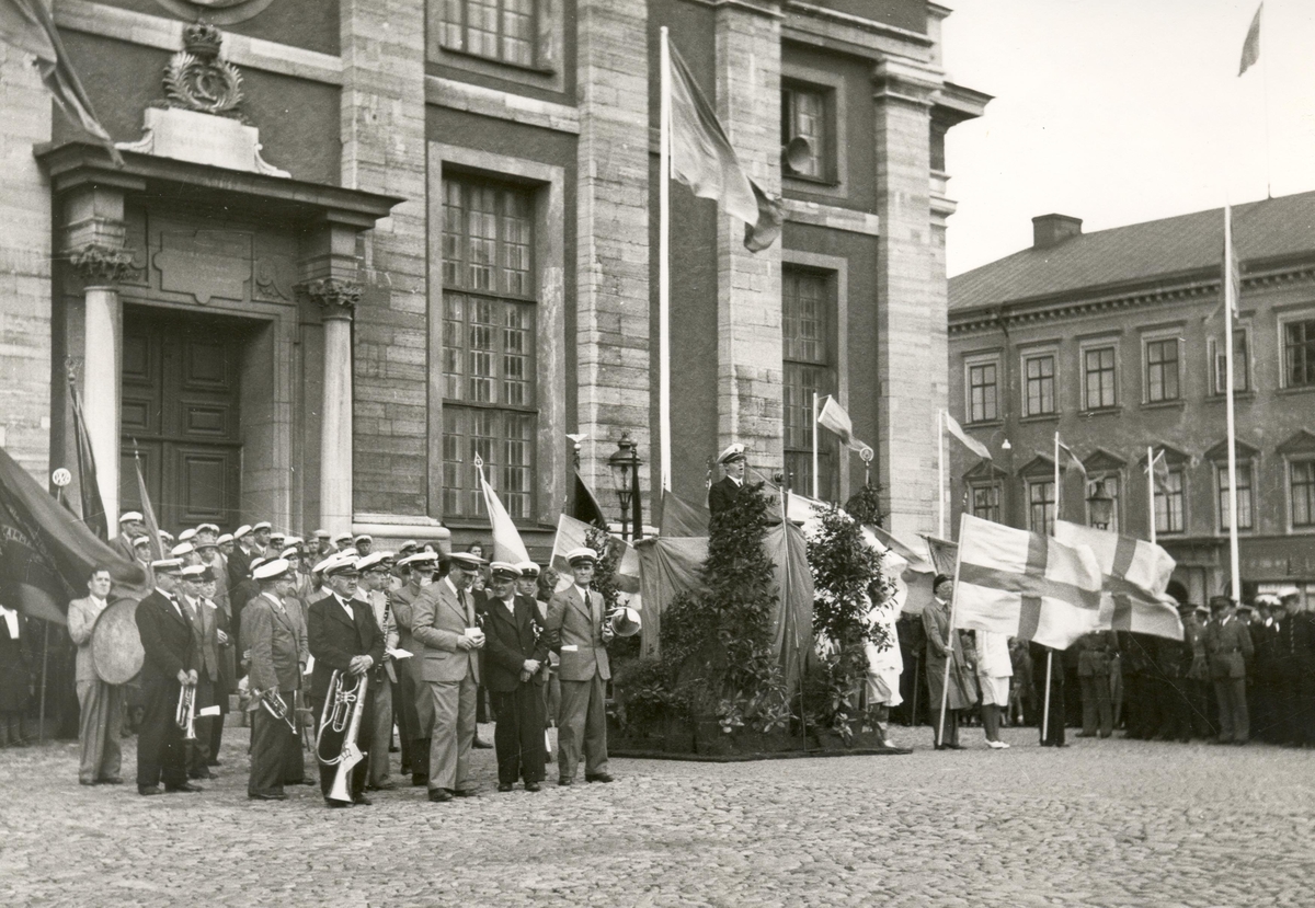 Svenska Flaggans Dag firas på Stortorget i kalmar. I talarstolen överste Carlgren F12.