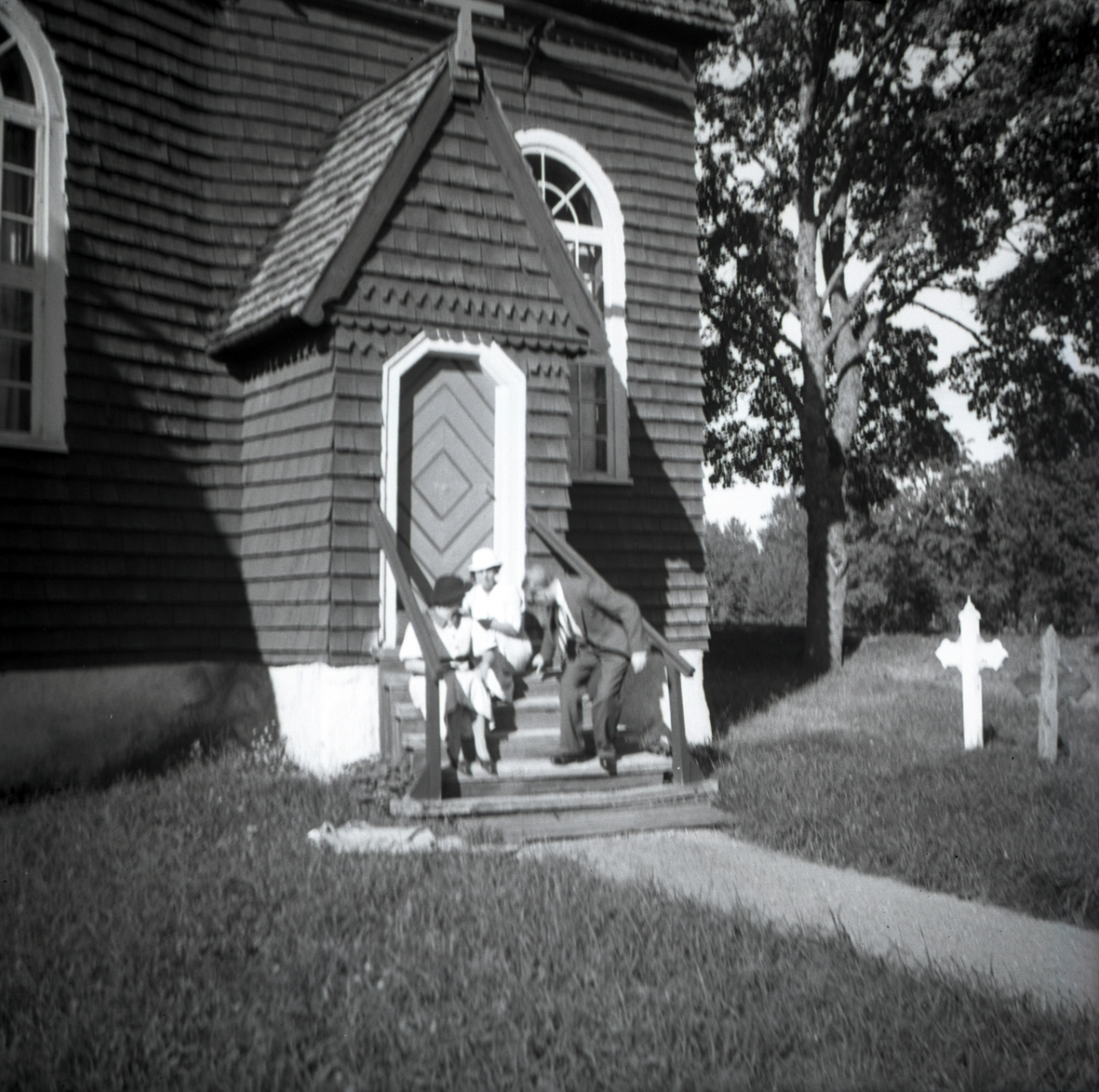 Tre personer på trappan till sakristian i Kråksmåla kyrka.