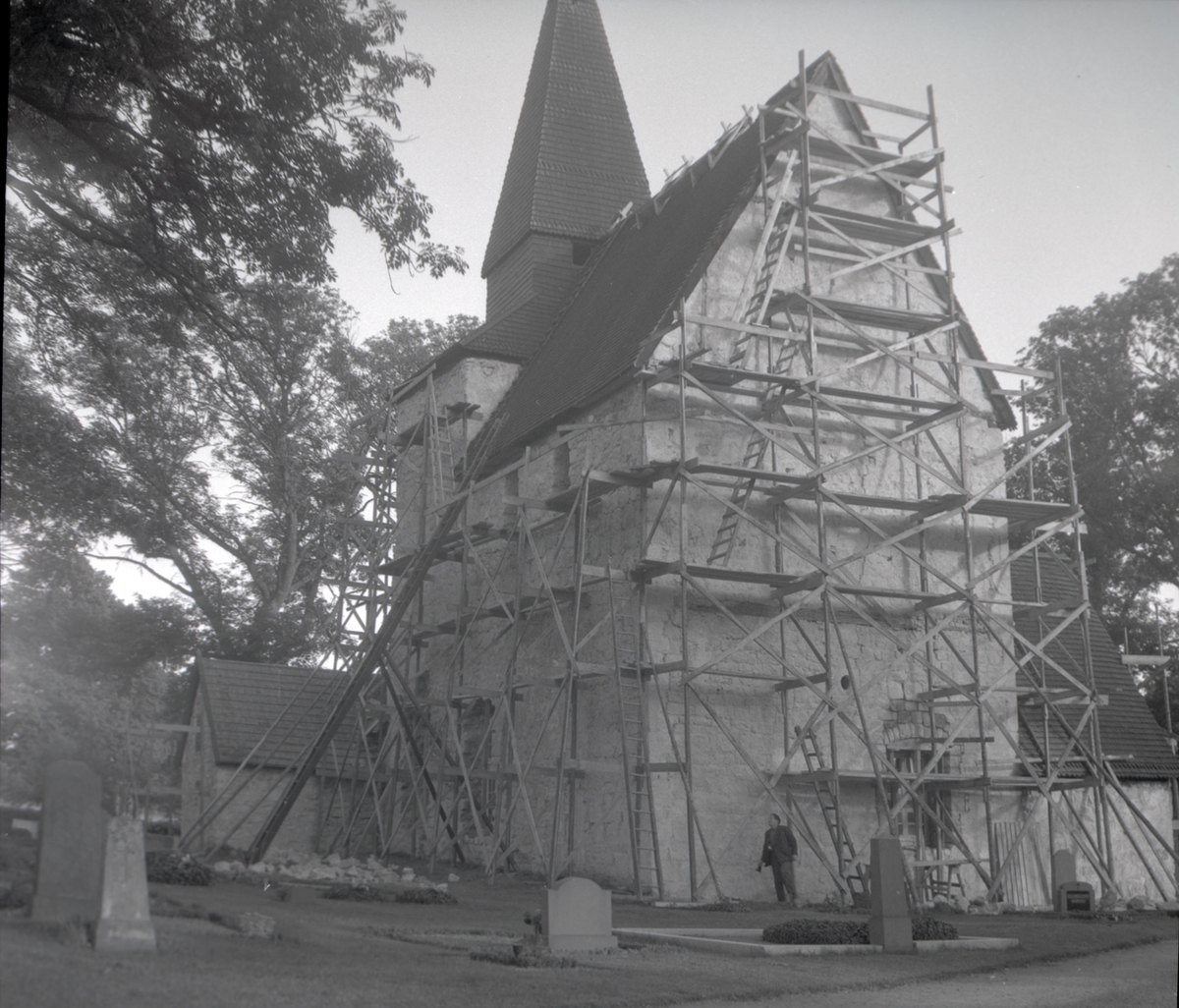 Hossmo kyrka, exteriör med byggnadställningar.