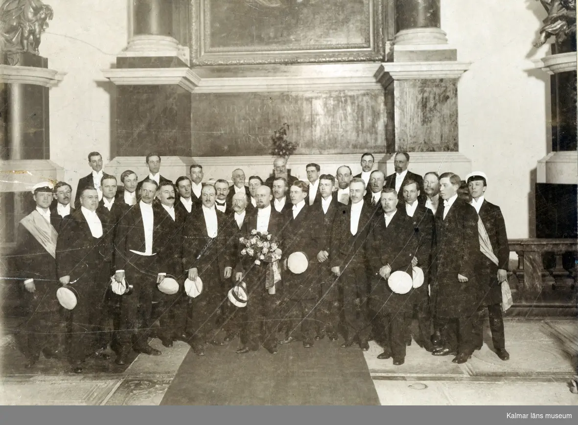 Strax till vänster från mitten sett, med svart fluga, står Gustaf Hjalmar Johansson (anfader till släkten Klette i Kalmar, född 17/5 1863, död 1935). Gustaf Johansson bodde på Tullslätten och var landsfiskal. Han var son till storsångare och kantor Johan Alfred Johansson, Åby.