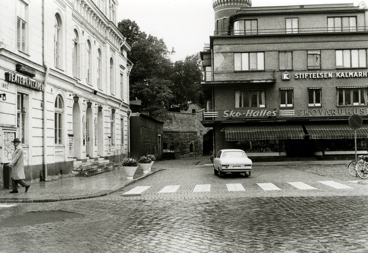 Bild tagen på Larmtorget i Kalmar. Till vänster ser vi Kalmar teater och rakt fram kvarter Blockmakaren och Västerport.