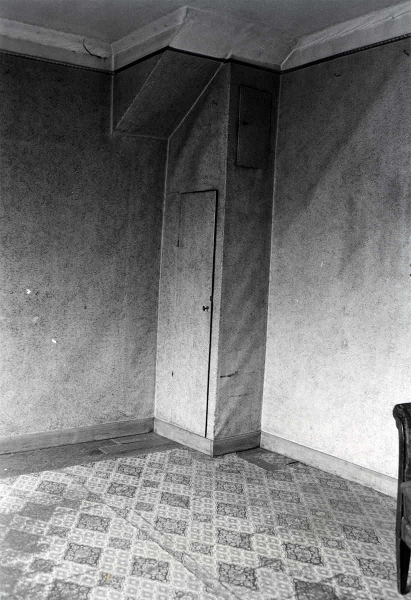 Interiör från en fastighet på Fiskaregatan. Det bortre rummet i mellersta tillbyggnaden. Garderob och nedskärning för vindstrappa.