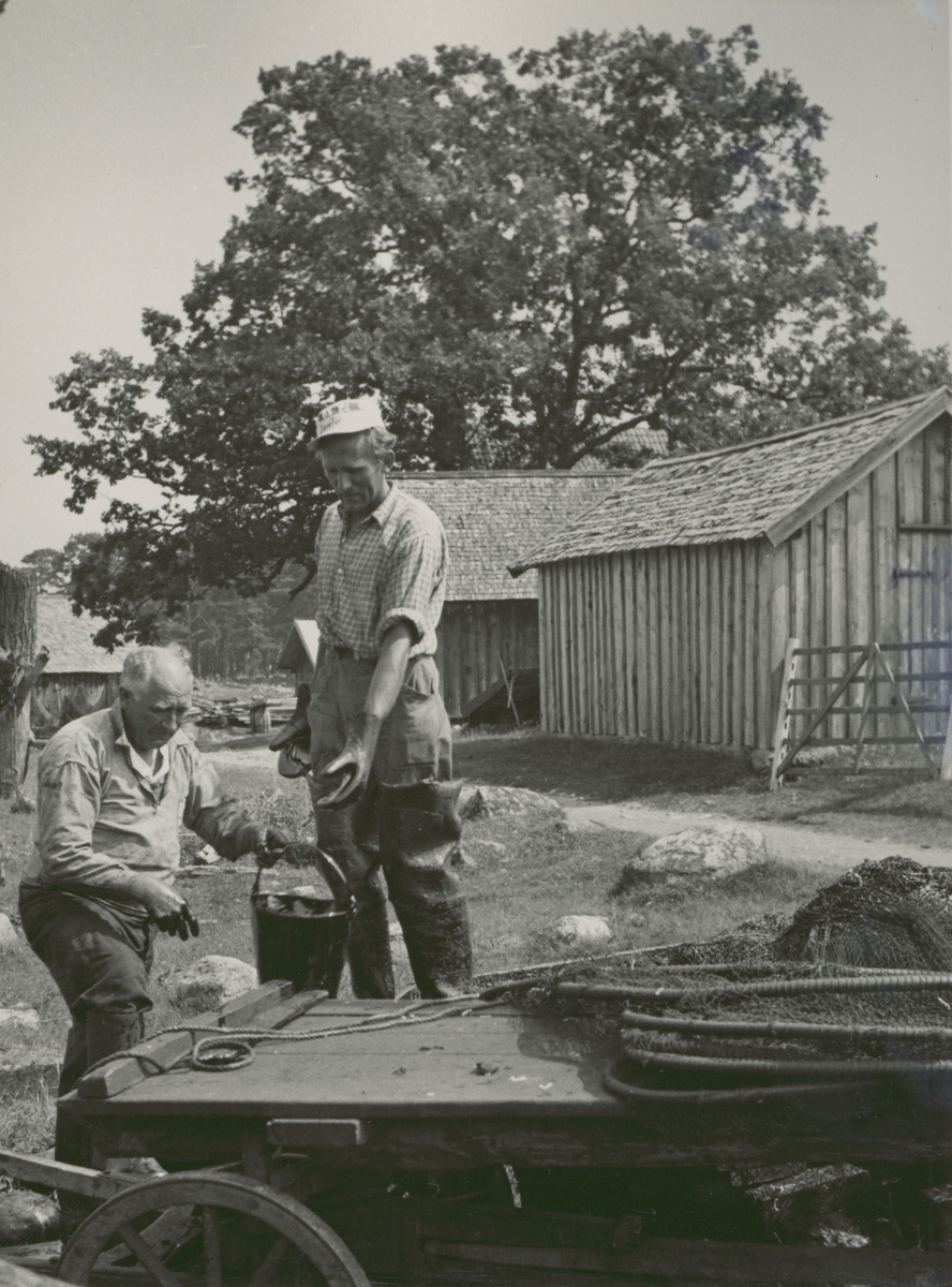 Georg Engström och sonen Göran med ett tjärat bottengarn på transportkärran.