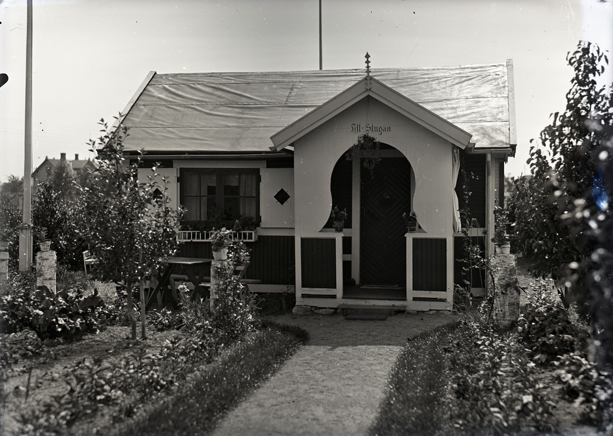 En stuga vid Kalmar södra koloniområde, fotograferad omkring 1930. Kalmar södra koloniförening grundades 1917 och har idag 105 kolonilotter. Området ligger strax söder om länssjukhuset i Kalmar med huvudingång från Stensbergsvägen.