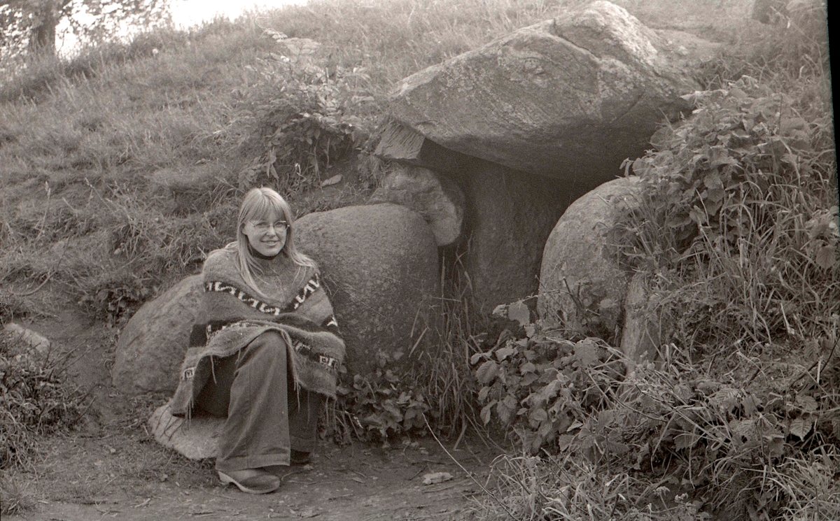 Titel: Birgitta Marnung vid gånggriften i Gillhög. Gånggriften är en megalitgrav. Megalitgravar (av grekiska mega, stor, och lithos, sten) eller storstensgravar är en serie typer som i Sverige endast anläggs under stenåldern, från c:a 3600-2900 f.Kr. Gånggriften består av stora stenblock, vilka är ställda så att de bildar en gravkammare och en tvärställd gång som leder in till kammaren. Sett uppifrån bildar kammare och gång ett "T". Gravkammaren omges ofta av en hög, som dock relativt ofta är låg och bara runt 1/3 av kammarens höjd som invändigt ofta är närmare 2 meter eller mer. Gånggrifterna ersatte dösarna och byggdes runt 3350-3200 f.Kr. varefter de användes under några sekler, men fynd har visat att man spontant eller periodvis ofta har använt gravkamrarna under senneolitikum och stenålderns slut vilket är detsamma som hällkistornas tid. Därtill har man sporadiskt gjort begravningar i högen eller i kammaren samt dess gång ända fram till järnåldern. I främst kammaren har man hittat obrända skelettdelar och en del enklare föremål från den primära perioden som sträcker sig till c:a 2900 f.Kr. samt spridda fynd från efterföljande perioder. Källa Wikipedia.