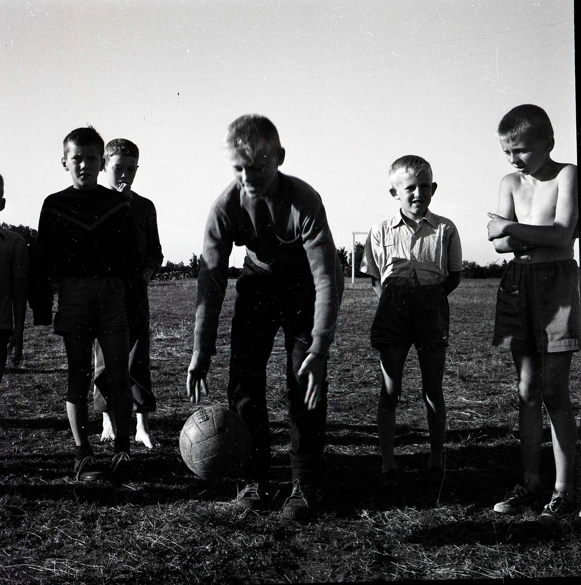 Pojkar som spelar fotboll i närheten av en sjöstuga.
