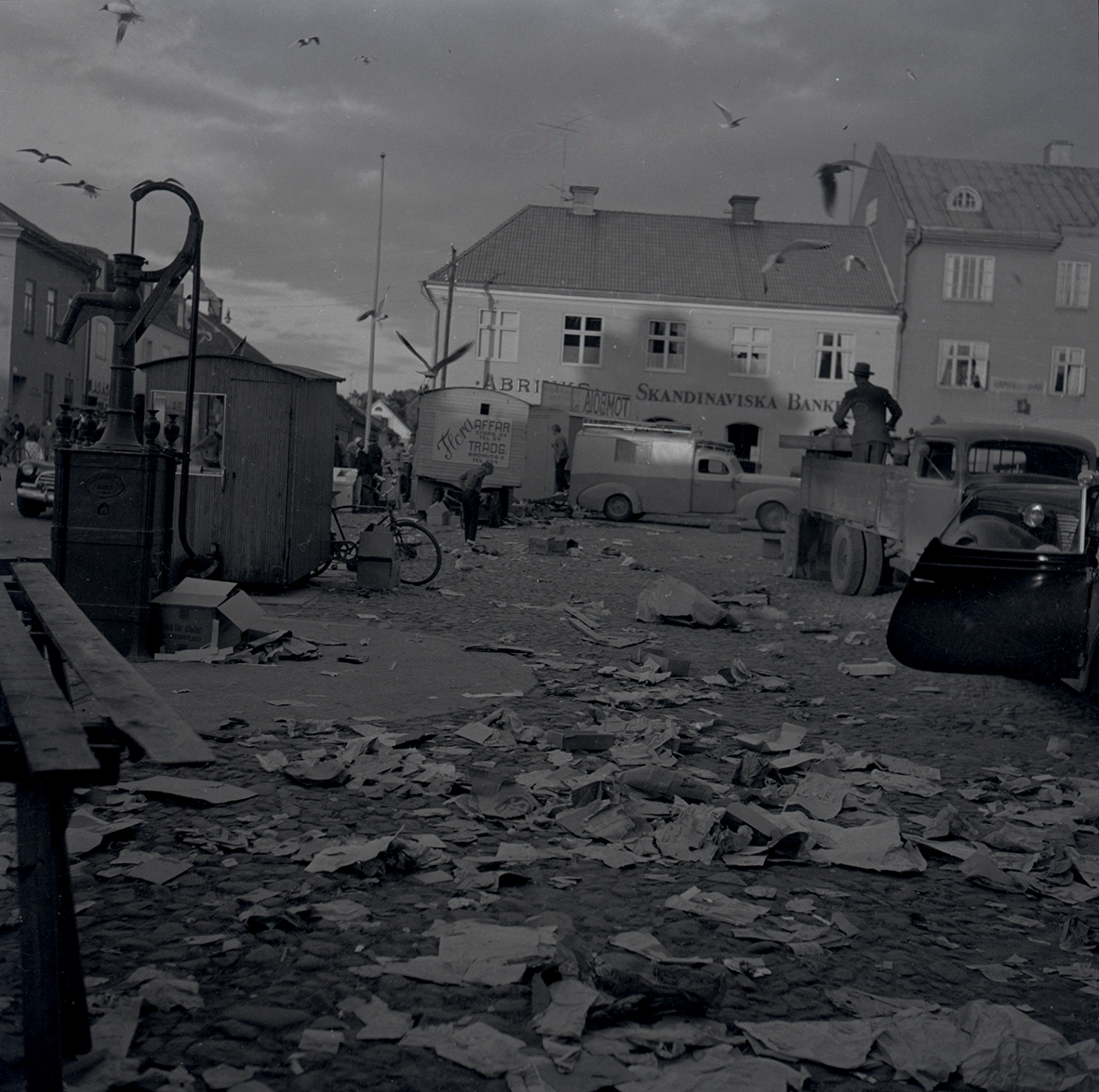 Torget på kvällen efter marknaden i Borgholm. Skräp på marken. Skandinaviska banken och Åbrinks i bakgrunden.