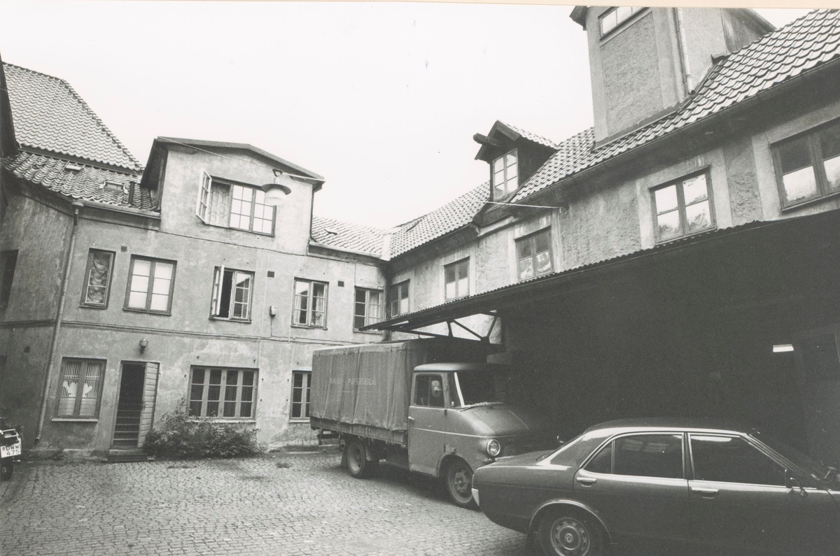 Gårdsfasad, innergård med lastbil och bil, Kvarnholmen väster om Västra Sjögatan. Bilderna är tagna inom ramen för Kalmar kommuns inventering av Kvarnholmens bebyggelse 1970-1971 och skänkta till länsmuseet.