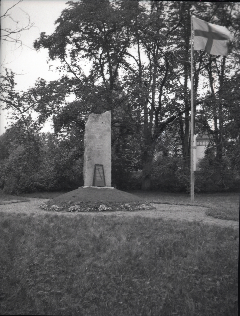 Minnesstenen över Peder Mikaelsson och en flagga på Tuna gård. Stenen restes som ett minne över att det var 300 år sedan den första Hammarskjöldaren, Peder Mikaelsson, blev adlad.