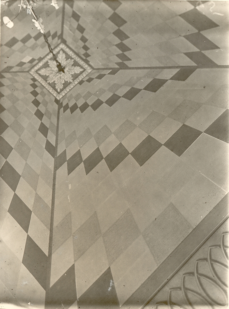 Huvudbyggningen: övre våningen. Herrummets tak, med målat skenperspektiv i starka färger: gult, rött o.s.v.