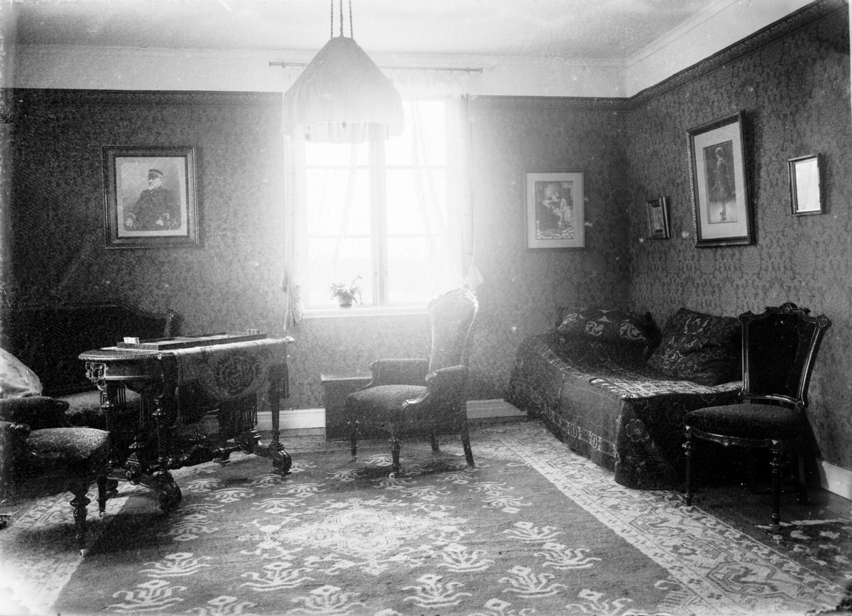 Ett sovrum med ett sällskapsspel på bordet. Enligt Walter Olsons journal är bilden beställd av ingenjör Karl Björklund ifrån Stensviksvägen 18 i Kalmar.