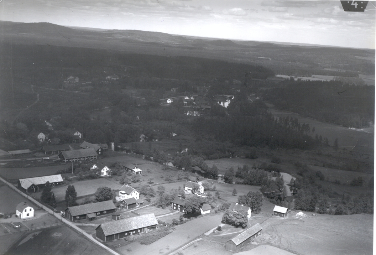 Flygfoto över Hulingsryd i Hultsfred. I förgrunden ser man nuvarande Bygatan och bakom bostadshusen syns Silverån. Till vänster i bakgrunden ser man även byggnaderna på Hultsfreds slätt.