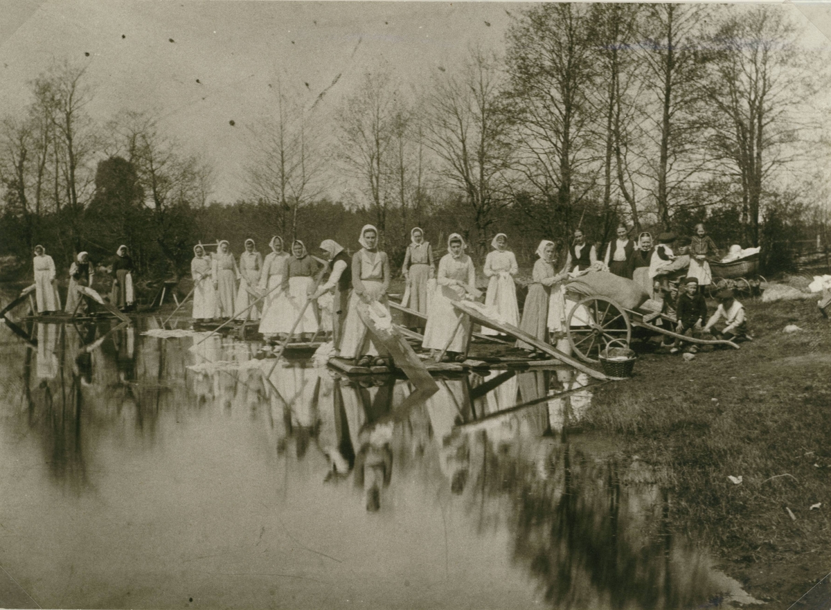Tvätterskorna vid Konungaydsbron 1905. De fyra tvättbryggorna ägdes av Ellen Berghult, Tilda Karlsson och Ida Gustavsson.
