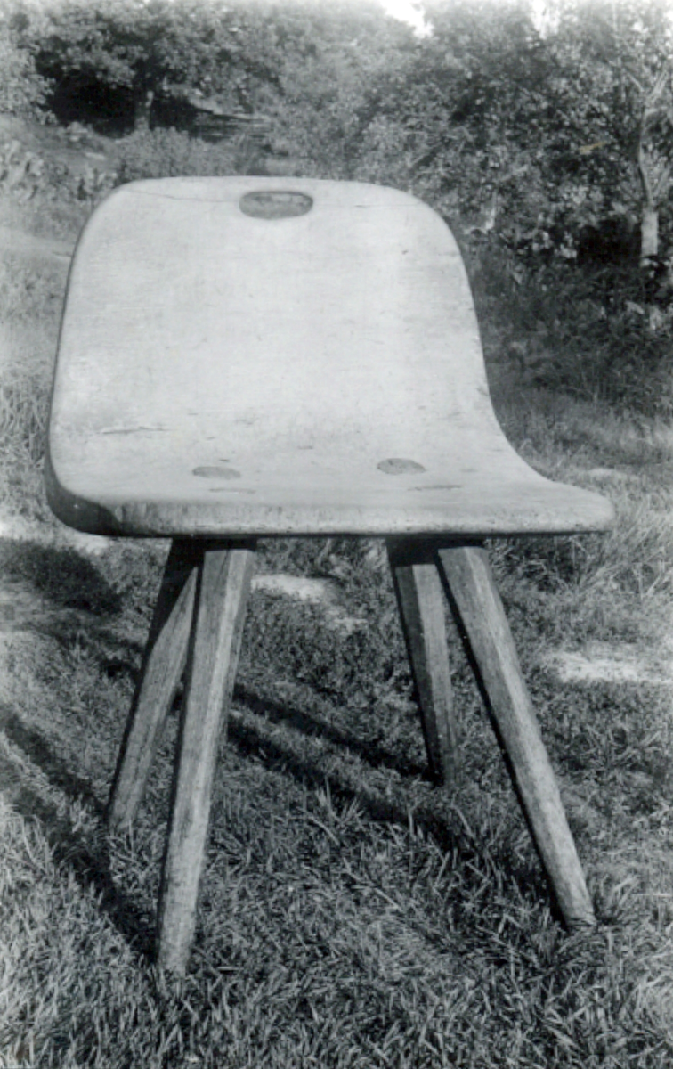 Stol, av ett björkstycke och 4 furuben. Högd 67 centimeter, bredd 48,5 centimeter, djup 35 centimeter. Tjocklek på björkstycket 1* - 5* centimeter, störst vid böjningen, i sitsen 3* centimeter. Åldern uppskattades av gårdens folk till omkring 200 år. (1937).