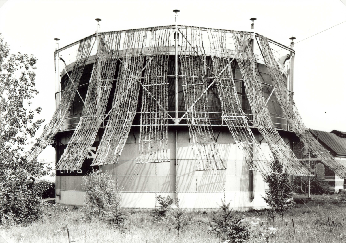 Krigskamouflage över gasklockan vid Kalmars gasverk.