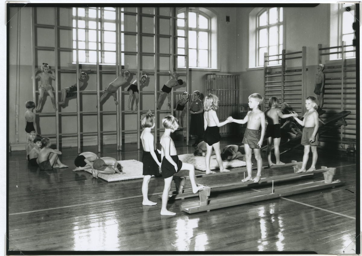 Pojkar och flickor har gymnastik på Rostads folkskoleseminarium.