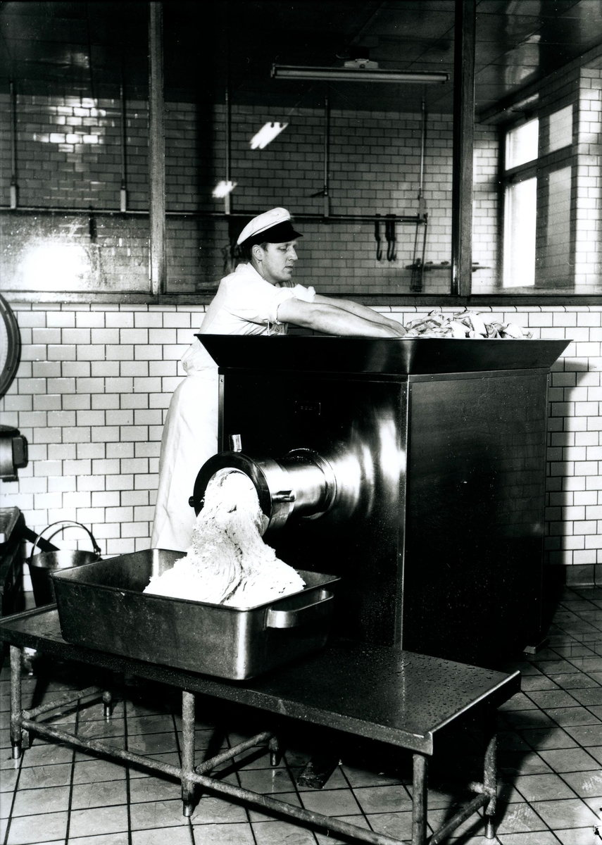 En charkuterist vid en köttkvarn på Kalmar kooperativa charkuteriförening u. p. a.