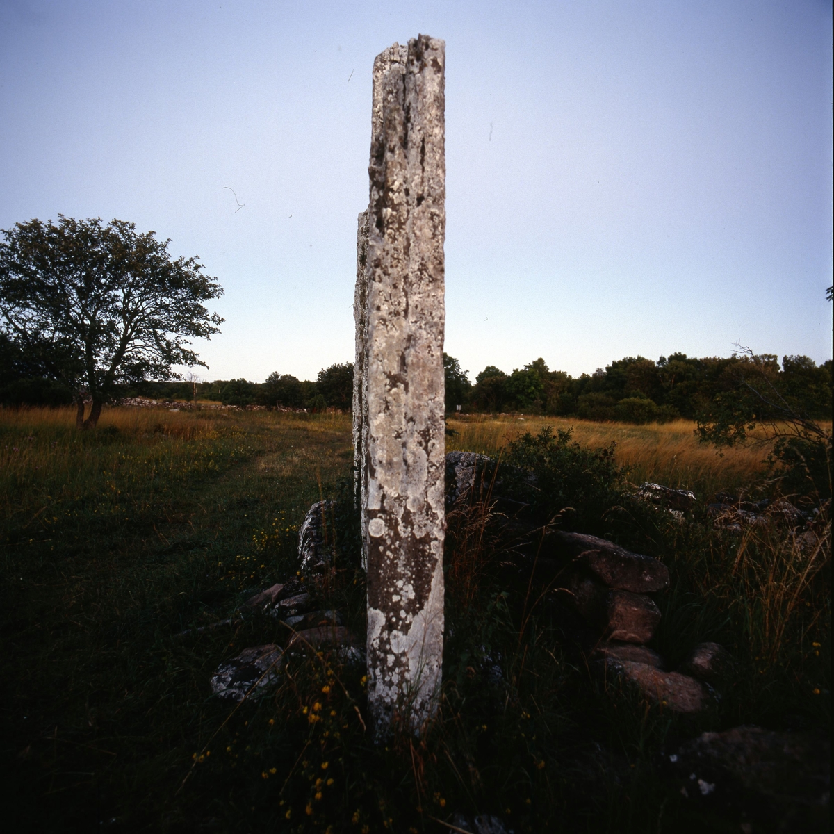 Titel: Odins flisor. Odens flisor består av två mäktiga kalkstensflisor, 2,5-3,0 meter höga. Enligt sägnen var det ursprungligen en enda sten men den sprack när Oden stack sitt svärd genom stenen för att tjudra sin häst, Sleipner. De höga kalkstensflisorna är en del av ett gravfält med ett 40-tal gravar. I början av 1900-talet gjordes en arkeologisk utgrävning där sex gravar undersöktes. Man fann skelett av tre människor, en vuxen och två yngre individer samt enkla vardagsföremål. (Uppgifterna är hämtade från Wikipedia)