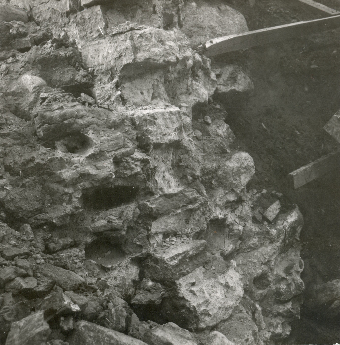 Västra förborgen. Nordligaster kontreforen söder om ingångsvalvet. Detaljer av muren under rivningen