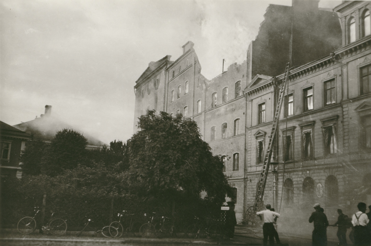 Ångkvarnsbranden. Brandmän har satt ut en brandstege.