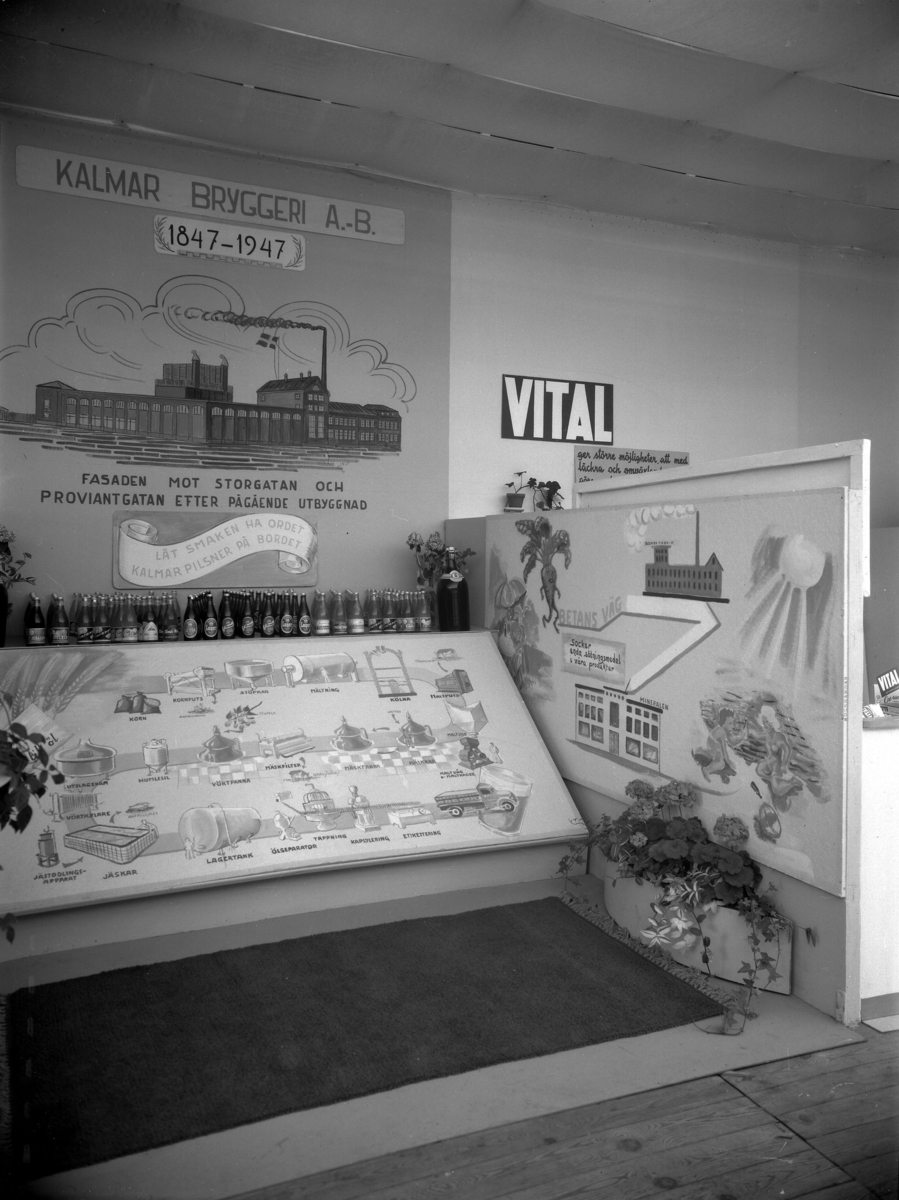 Text på den stora skärmen: "Kalmar Bryggeri A-B 1847-1947. Fasaden mot Storgatan och Proviantgatan efter pågående utbyggnad." "Låt smaken ha ordet Kalmar Pilsner på bordet"