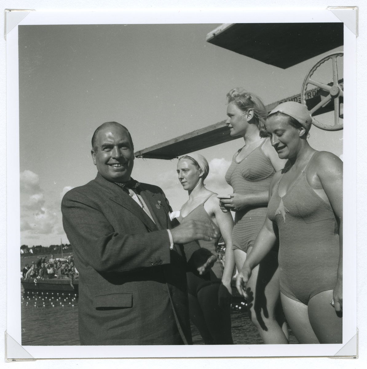 Från SM i simning, som 1946 hölls vid Långviksbadet i Kalmar. Nils Backlund premierar vinnarna i damernas svikthopp. Från höger trean Britt Walther, IFK Sthlm, ettan Mildred Netzel, SKK, och tvåan Eva Petersen, SHK.