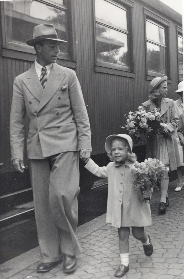 Arvfurste Gustav Adolf håller prinsessan Christina i handen vid ankomst till Kalmar central före överfarten till Öland och resan till Solliden. I bakgrunden syns prinsessan Birgitta.