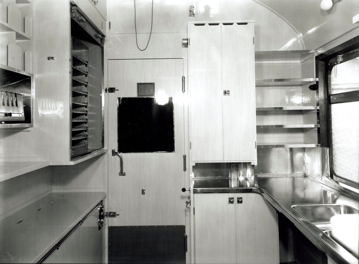 Interiör från köket i en restaurangvagn tillverkad på Kalmar Verkstads AB.