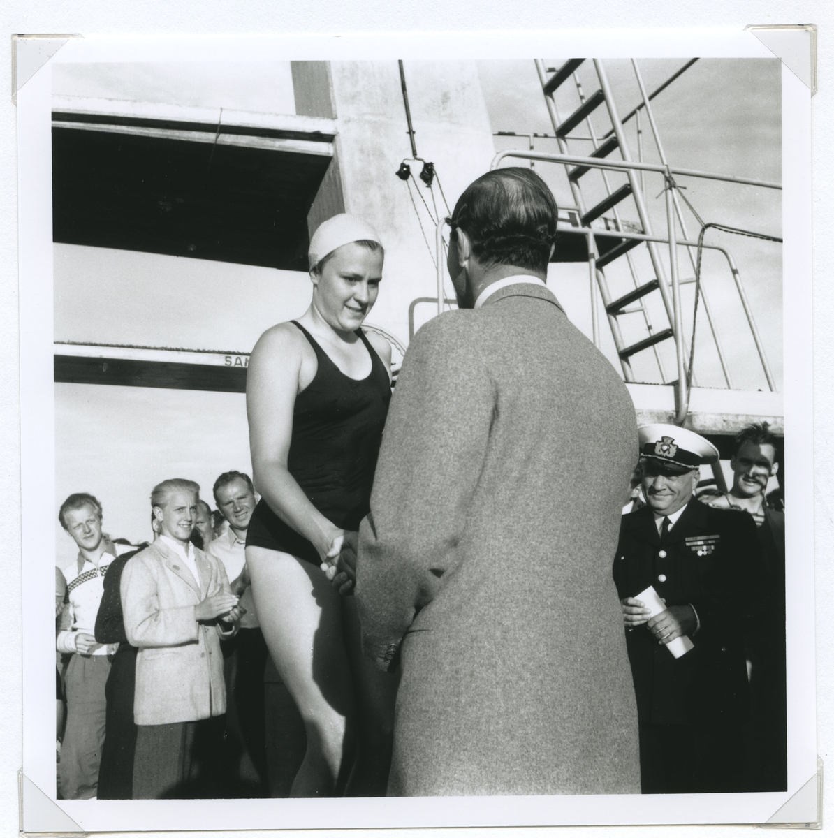 Prins Gustaf Adolf gratulerar Annie May Asp under SM i simning, som 1946 hölls vid Långviksbadet i Kalmar.